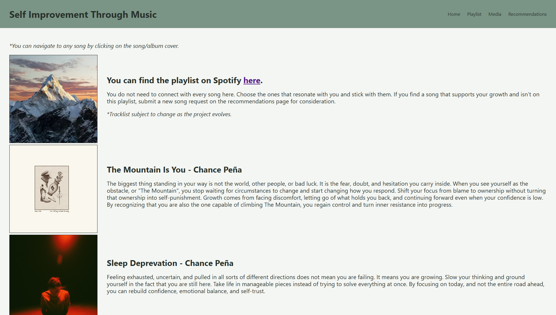 This project is a curated self improvement platform that uses music and media intentionally to support growth. It analyzes songs, videos, books, podcasts, and films based on their emotional impact and underlying message, filtering out content that reinforces fixation, avoidance, or false reassurance. The goal is not to promise comfort, but to help users process emotion honestly, regain clarity, and move forward with discipline and perspective.